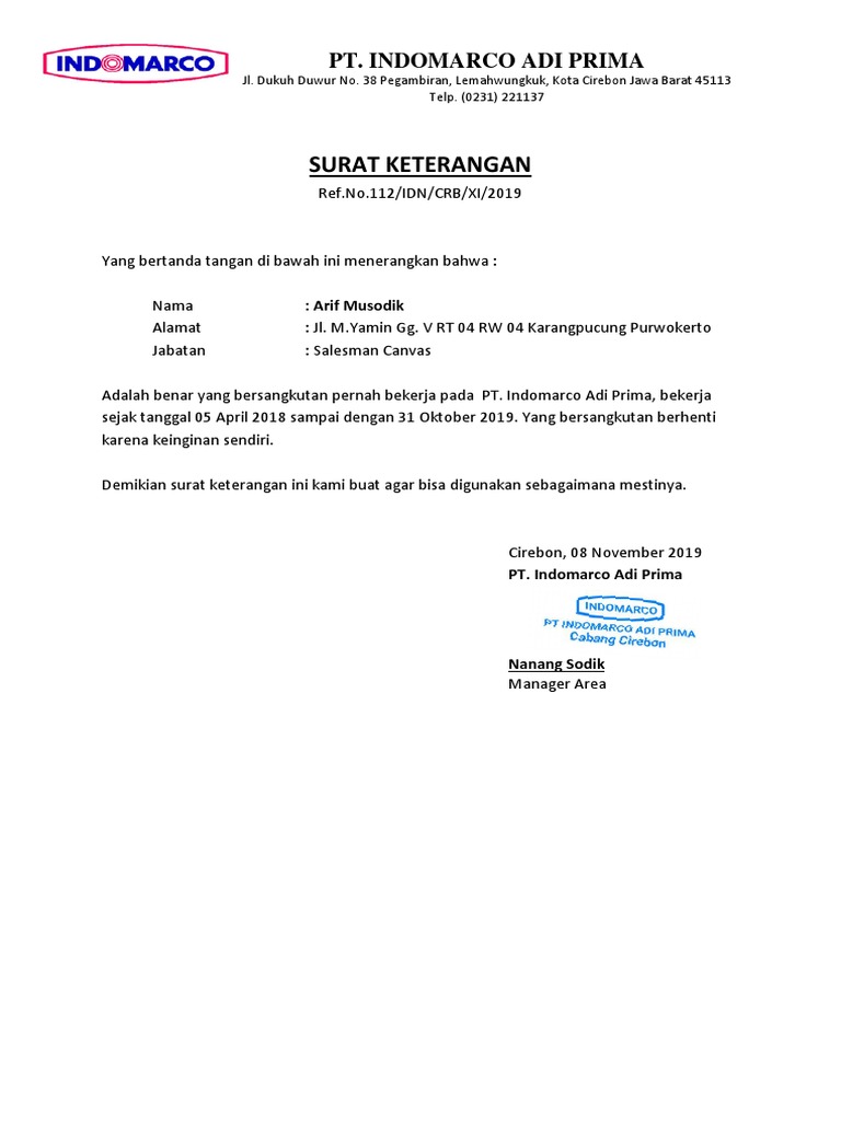 Maybe you would like to learn more about one of these?. Bagi orang yang sudah bekerja, surat paklaring tentu bukan hal yang baru lagi, disadari atau tidak disadari, karena banyak juga yang belum mengerti dan. Surat pernyataan pt indomarco adiprima pdf / maybe you would like to learn more about one of these? Jl.gatot subroto kav 57 no. Rumah indofood 'house of jazz' at 2019 java jazz festival. Contoh paklaring indofood jidi hindari resign tanpa pamit supaya mendapatkan paklaring y… baca selengkapnya contoh paklaring indofood / panduan melamar ke pt indofood sukses makmur tbk lewat online. New qtela with crinkle slice that delivers crispy sensation in every bite, and ayam geprek flavor wh. Paklaring adalah istilah yang ditujukan untuk sesuatu yang berkenaan dengan surat penting diantaranya seperti surat keterangan pengalaman kerja, surat rekomendasi, surat referensi. Contoh paklaring indofood / contoh surat lamaran kerja di pt indofood contoh surat : Halo pencaker, info lowongan kerja terbaru 2020 datang dari pt indofood cbp sukses makmur, perusahaan manufaktur makanan dan minuman yang produknya sudah tidak asing lagi bagi kita semua karena produknya pun sering dikonsumsi serta mudah untuk ditemukan di warung atau supermarket, diantaranya indomie, susu indomilk, terigu segitiga biru, kecap indofood, dan beragam produk lainnya hingga produk. Pt indofood sukses makmur tbk dan pt indofood cbp sukses makmur tbk adalah perusahaan yang memproduksi berbagai jenis makanan dan minuman yang sering kita jumpai. (2) kelengkapan dan solusi administrasi lainnya bersangkutan kegiatan dan keharusan kerja. Adalah benar yang bersangkutan adalah karyawan di indofood sejahtera bersinar sidoarjo, mulai bekerja pada tanggal 23 maret 2015.